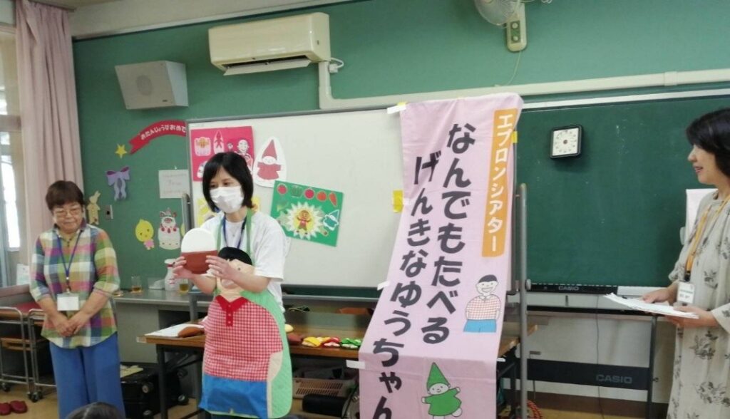 エプロンシアター中にも積極的に参加をしてくれました。演じている私達と、子ども達とのやり取りができ、時間が短く感じました。