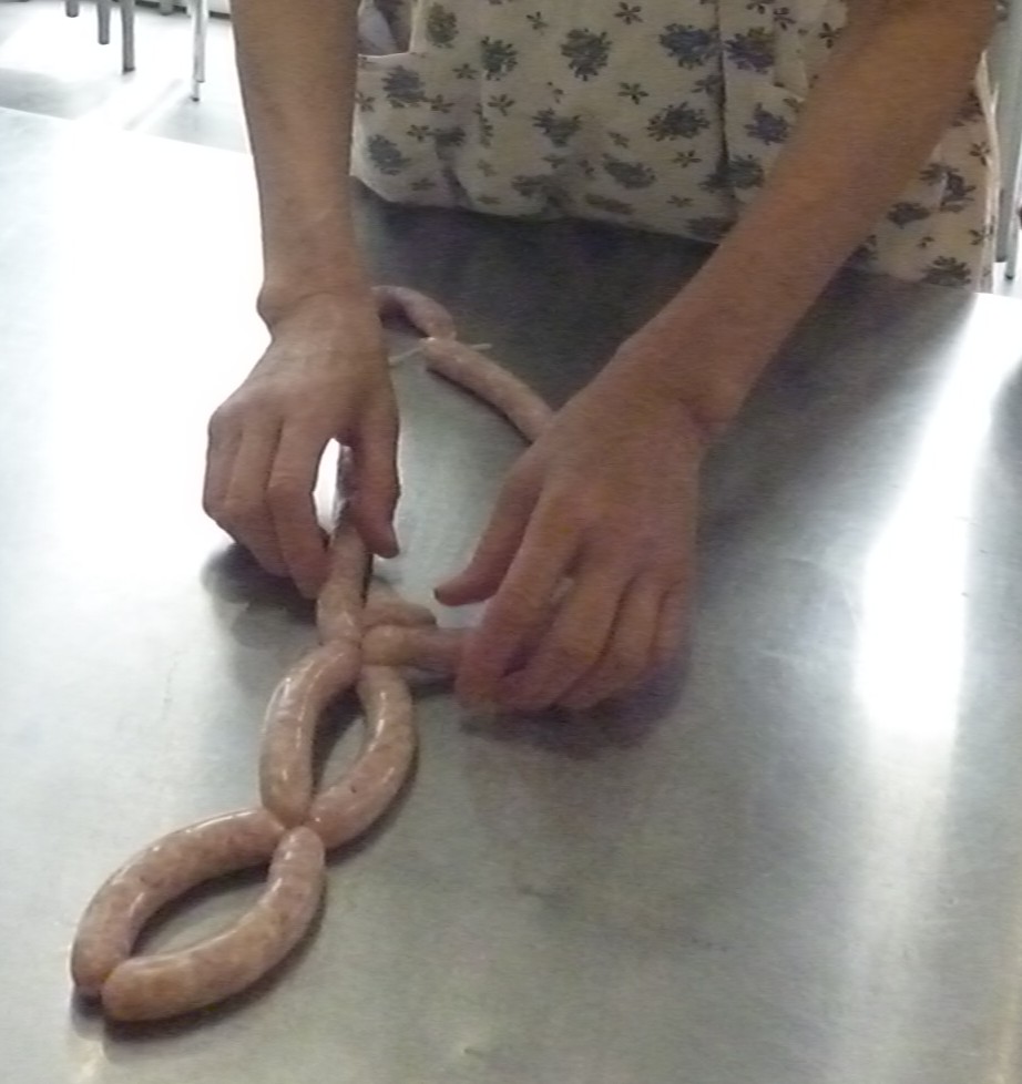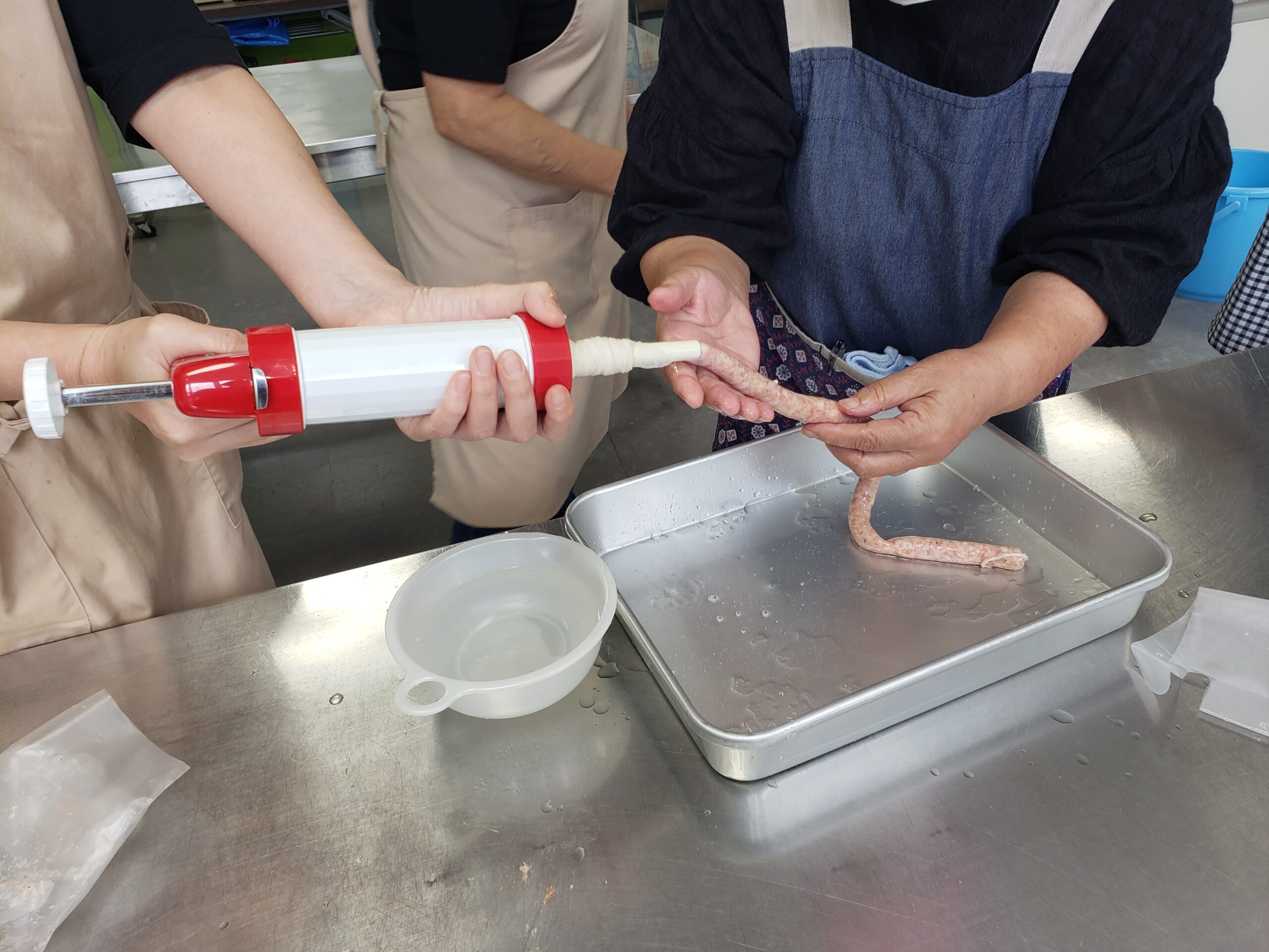 手作りウインナーは羊の腸に香辛料とひき肉で作った具材を実際に詰める(ケーシング)体験で日本では大正から行われている手法。添加物なしの食品加工を学びました。